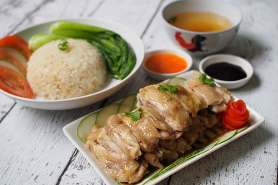 하이난식 치킨 라이스는 부드러운 닭고기와 닭 육수로 지은